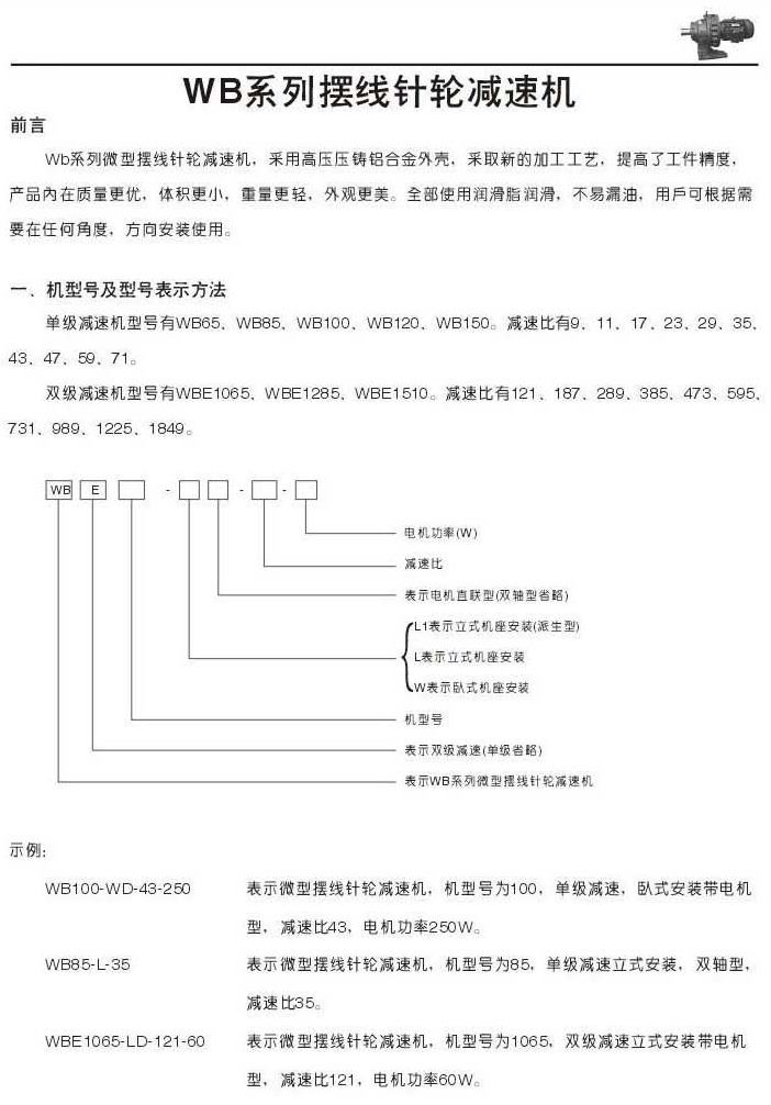 WB系列微型擺線針輪減速機(jī)描述機(jī)型號(hào)和規(guī)格表示法